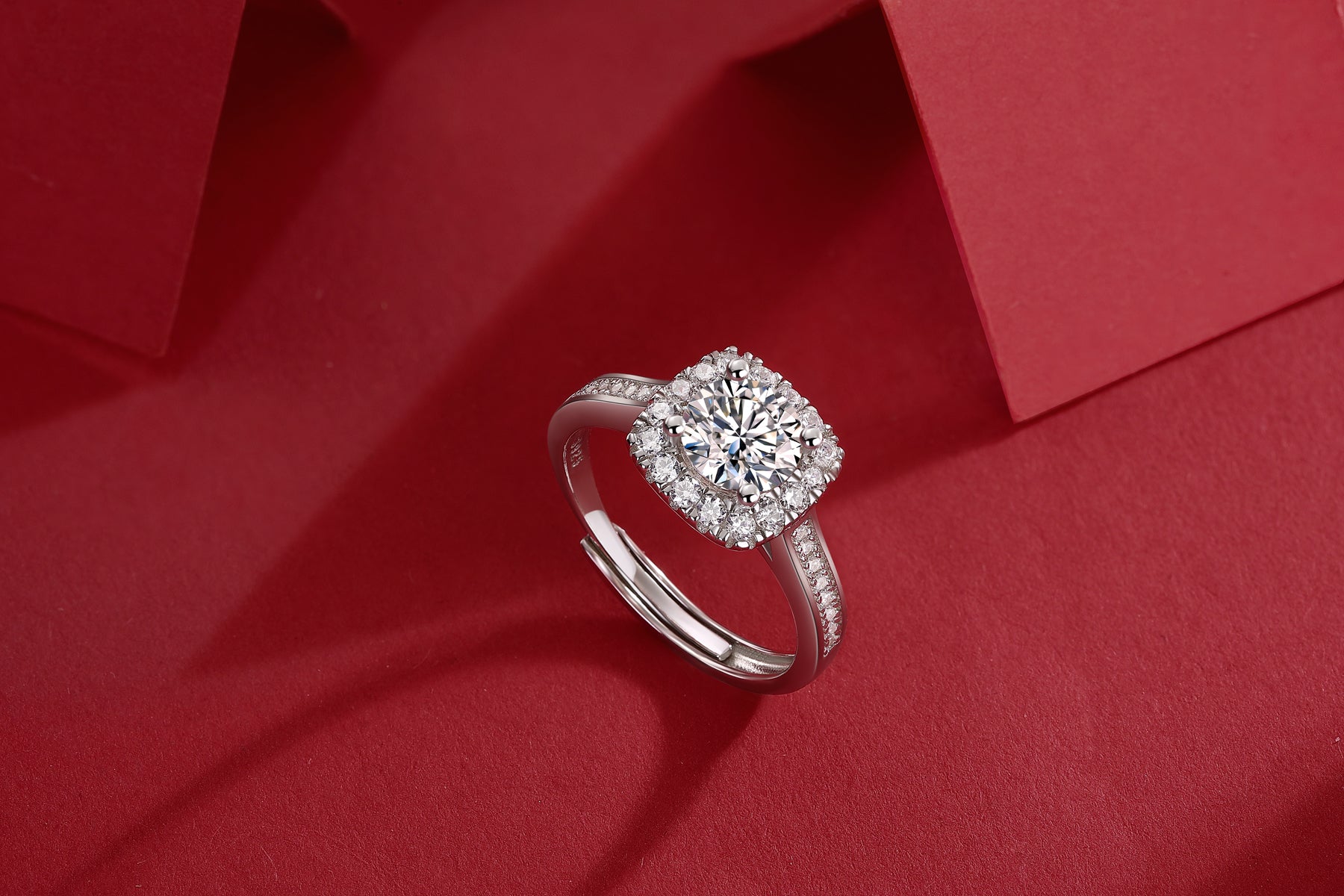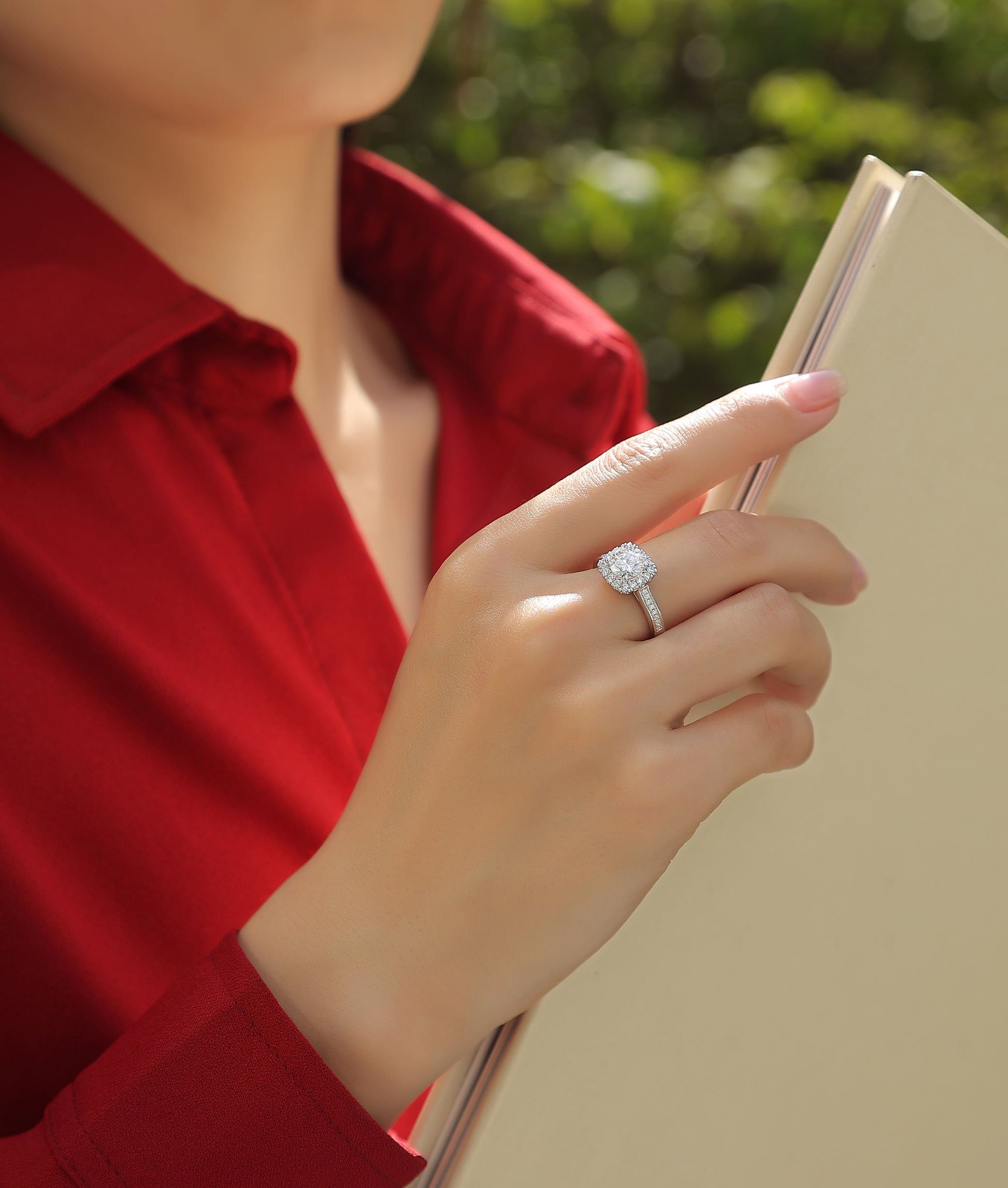 「ラウンドとスクエアが流れるように調和して、愛が指先で重なり合うデザインです。小さなダイヤが主石を囲んで、さらに強いファイアを引き出してくれるんです。」